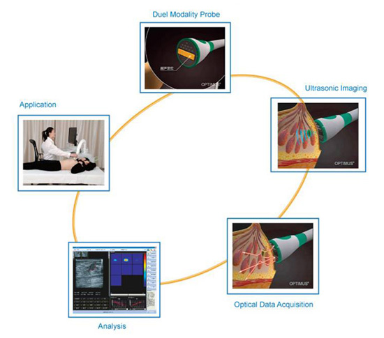Dual Modality Imaging: -OPTIMUS combines the advantages of ultrasound imaging and DOT imaging to provide diagnostic information on breast lesions -Ultrasound imaging demonstrates structural changes and anatomy of breast tissues, allowing doctors to analyze a multiplicity of conditions and assess lesions -OPTIMUS imaging provides functional information on breast tissues, and reveals the concentration of hemoglobin and oxygen saturation, which are directly related to angiogenesis of lesion
