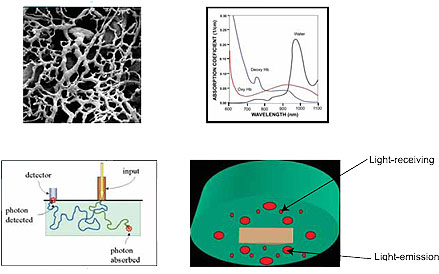 Diffusion Optical Tomography (DOT): -Tumor Angiogenesis: In 1994, the Angiogenesis Foundation identified angiogenesis as the “common denominator” in important diseases, including breast cancer. Research has shown that solid breast tumors become clinically relevant once they develop a blood supply. Subtle vascular changes are often associated with breast cancer in its earliest stages. Recent technology detects vascular changes and forms a vascular profile to indicate the early vascular zed lesion. -Detection with Multi-Wavelength – OPTIMUS employs multi-wavelength DOT scan to measure HBO2 AND Deoxy HB and calculate hemoglobin concentration and tumor hypoxia -Probe Design – With unique NIR probes for functional imaging design, OPTIMUS images reflect optical diffusion status in different tissue positions