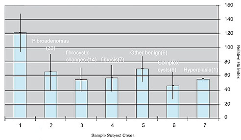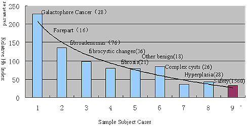 Clinical Trial and Data in China: HB Index Chart Clinical Trials Clinical trials were performed in four hospitals in China. The diagnosis result of OPTIMUS system was compared with X-ray mammography and biopsy results. With 90 trial cases, OPTIMUS system demonstrates 100% sensitivity and 86% specificity. Screening and Diagnosis OPTIMUS is used in a hospital specializing in tumor as a screening and a patient diagnosis device. Among 833 women examined over a two-month period, 38 were diagnosed as suspicious malignant lesions. 23 out of the 38 patients underwent surgery with 20 confirmed cancer cases.