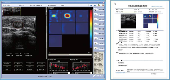 OPTIMAGE-Diagnostic Tools -Dual modality operation and visualization, simple and easy to use -Rich information about tumor blood and morphological characteristics, including hemoglobin(HBT), Oxygen concentration(SO2), tumor shape, lobe, and orientation, etc. -CAD provides standard results in compliance with BI-RADs -Easy and clear report generation, storage, and PACs compatible