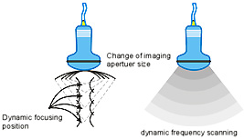 - All focus beamforming techniques. Unlike the normal digital beamforming, which can only achieve 2~4 focus point for transmit direction and every point for receive direction, this technique can achieve both transmit and receive focuing effect for every single point, and thus greatly enhances the image quality in lateral direction.
